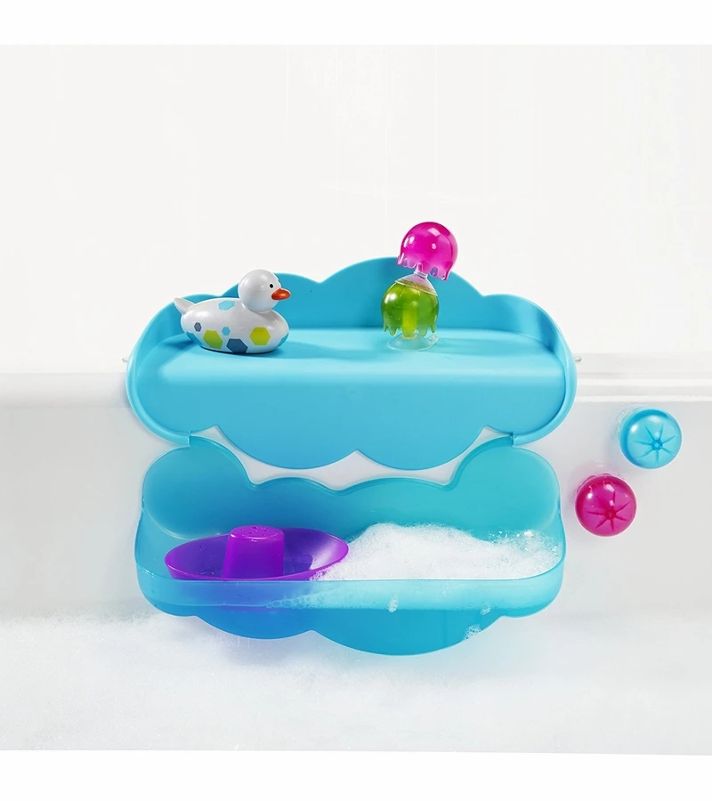 To you its the edge of the tub. To them, its a racetrack, runway, launching pad, battlefield and (unfortunately) tidal wave zone. Enter Ledge, the perfect way to extend your tubs useable play space and keep water off the bathroom floor all at once. Ledges fold-down toy shelf allows imaginations to run wild, while drain holes keep the tub water from doing the same. Hows that for bath time brilliance?