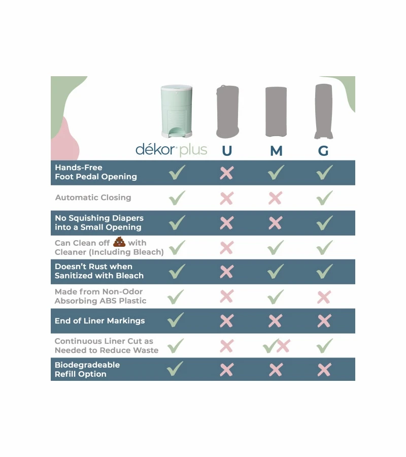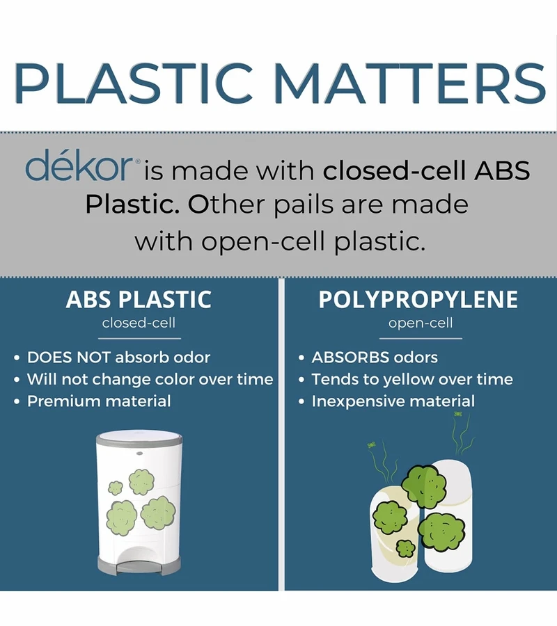- Dékor Plus is their largest option, best suited for a single diaper pail for the whole household and with less frequent emptying; perfect for twins/multiples