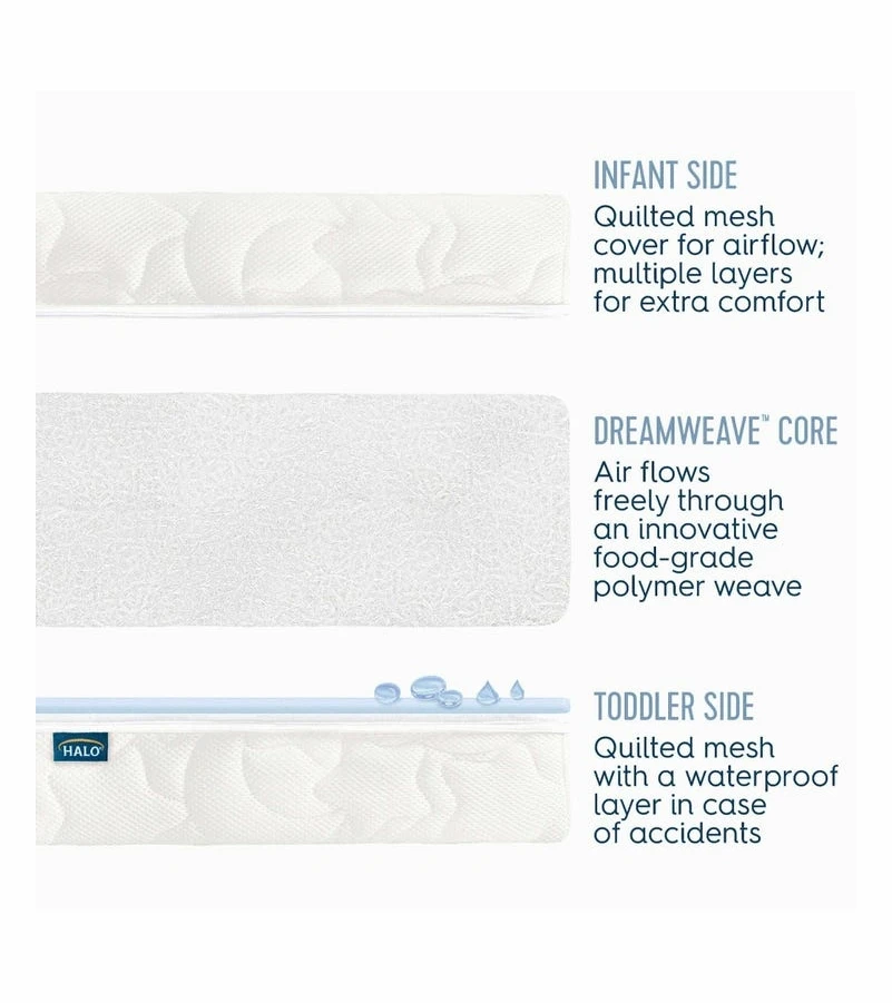 - Includes infant side and waterproof toddler bed mattress side