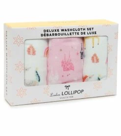 Hooded towel measures 32″ x 32″, and washcloth measures 12″ x 12″.