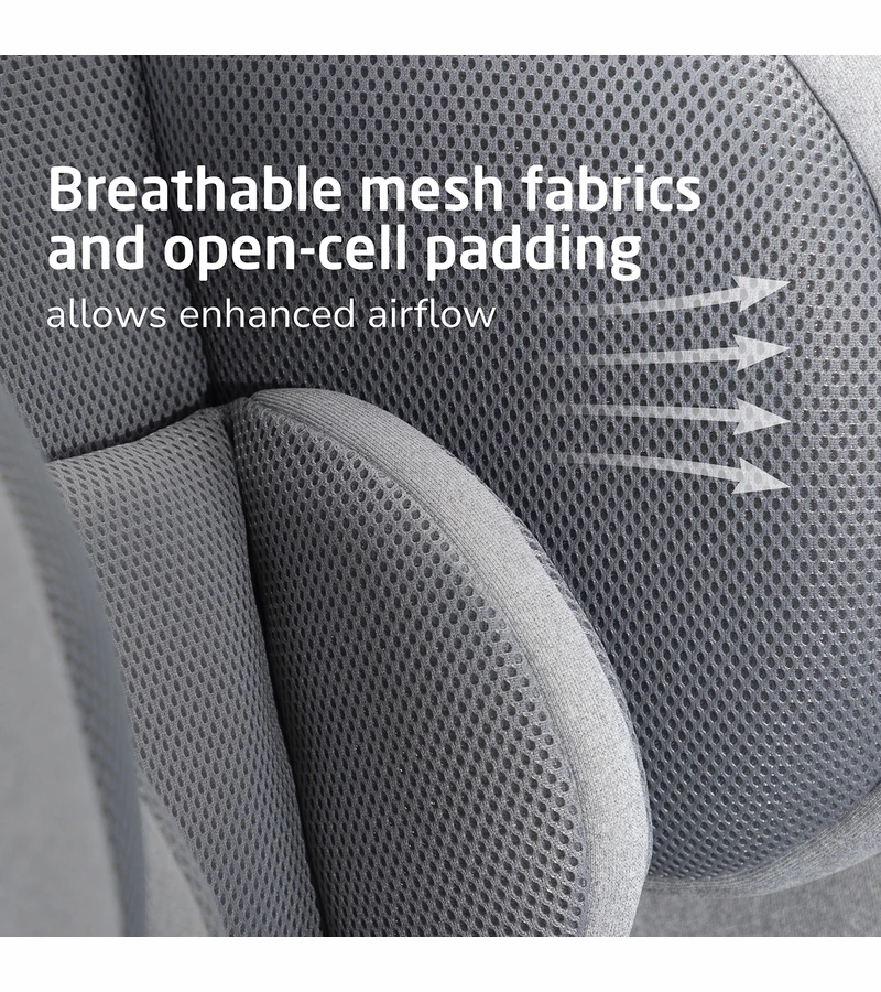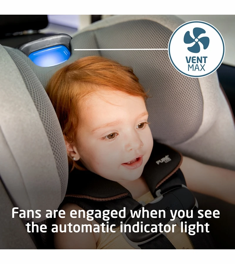 Don’t sweat it on hot days––the first-of-its-kind Pria Chill will help keep your little one comfy in their car seat. VentMax is an integrated, automatic fan system (2 in the lumbar area and 1 in the headrest) that turns on when built-in temperature sensors reach 72° and adjusts speeds to circulate air through the soft, breathable mesh fabric. You’ll know the VentMax fans are engaged when you see the automatic indicator light. The VentMax system is also water resistant (don’t worry about spills!), super quiet, and shuts off when the car power port does.