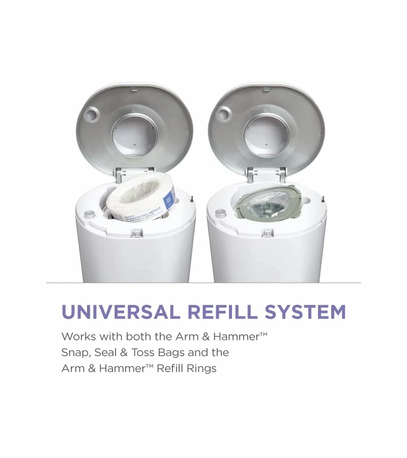 - Universal refill system – compatible with all Munchkin branded refill rings, Snap, Seal & Toss bags, up & up and Nursery Fresh refills. Use with Munchkin UV Snap, Seal & Toss for best results.
