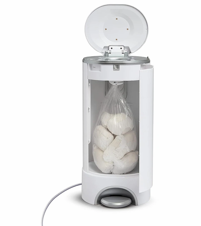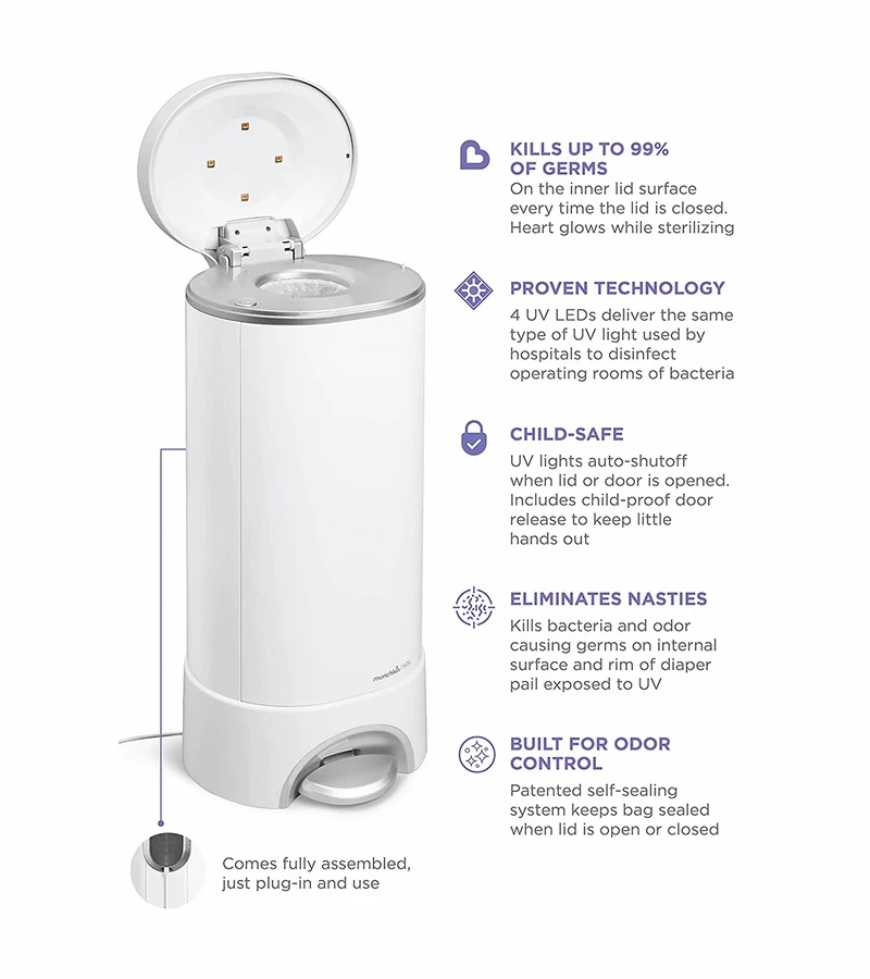 Don’t make a big stink about dirty diapers – get the Munchkin UV Diaper Pail instead! Odor control meets germ control in this sleek nursery must-have, which uses the power of hospital-grade UV light to eliminate odor causing bacteria and germs. The patented self-sealing system keeps the disposal bag shut and free of smells, even when you open the lid. Meanwhile, 4 gold LED lights automatically sterilize internal surfaces, killing up to 99% of bacteria and viruses including Staph, Klebsiella and E. Coli. Compatible with all Munchkin branded refill rings and Snap, Seal & Toss bags, as well as Up & Up and Nursery Fresh refills, this universal diaper disposal system puts UV sterilization first. Time to de-stink baby’s room with the chemical-free, germ-busting power of UV light!