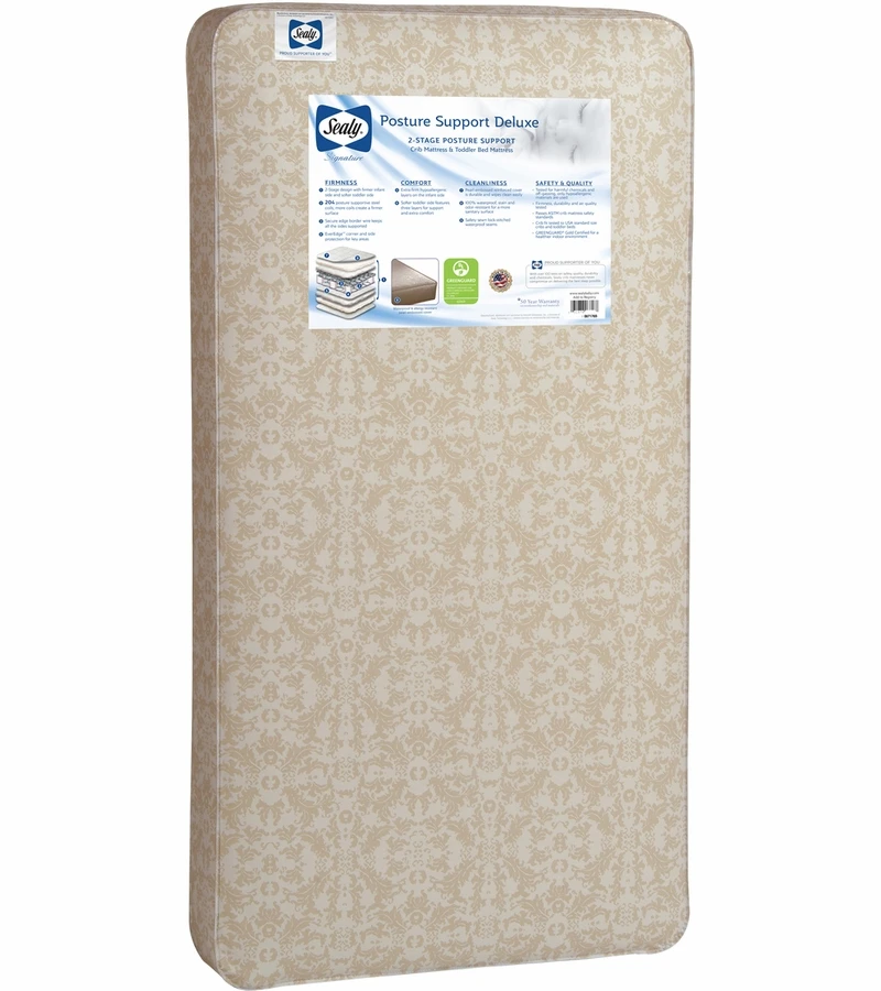The Sealy Posture Support Deluxe 2-Stage Crib Mattress offers your newborn the firmness of premium 204 innerspring coil system. More coils create a firmer overall surface for your baby. Plus weve enhanced this model with secure steel edges and 6 EverEdge guards to help protect baby near the corner and sides. This is perfect for when children sit near the edge of the bed.