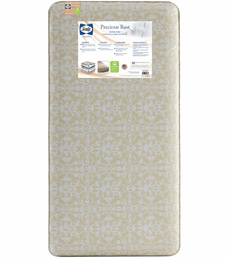 Sealy is the premier brand in sleep products. More babies sleep on a Sealy than any other brand. Sealy crib mattresses are designed and engineered for proper support and tested for high safety standards. The Sealy Precious Rest Crib Mattress is an excellent choice for a firm, yet comfortable and lightweight option for baby. ItÂ’s highly durable and extra firm with a 120 heat tempered, innerspring coil system that is enhanced with a thick gauge all around border wire that protects the edges just like an adult mattress. All the materials used are hypoallergenic including the hypoallergenic comfort layers that will help keep your baby comfortable and properly supported. Waterproof crib mattresses are essential to protect baby and the mattress against leaky messes. The cover is waterproof, stain-resistant and made with lock-stitched waterproof binding. This is easy-clean to help prevent mold and bacterial growth. The entire crib mattress is GREENGUARD GOLD Certified, a high standard to help ensure a healthier indoor environment for baby. Measures 52 x 27.5x 5.25 inches. 20 year warranty on workmanship and materials.