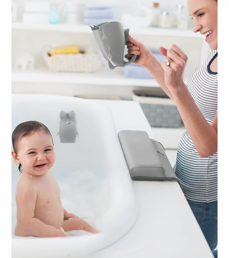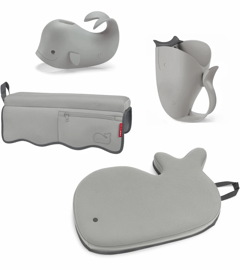 Bathing baby is a breeze with the help of our handy bathtime helper kit. Packed with four of our popular Moby bath basics in decor-friendly grey, the four-piece set includes a rinser, soft spout cover, padded elbow rest and kneeler. Now parents can be just as comfy as little ones during tub time. Makes a welcome gift for first-time parents, too!