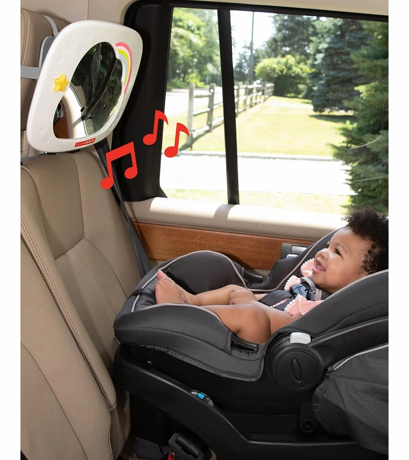 Entertain, soothe and keep an eye on baby with our cute backseat baby mirror. Featuring music, white noise sounds and multicolor lights, the sweet cloud design also includes a remote control so it’s easy to adjust depending on baby’s (and your) needs.