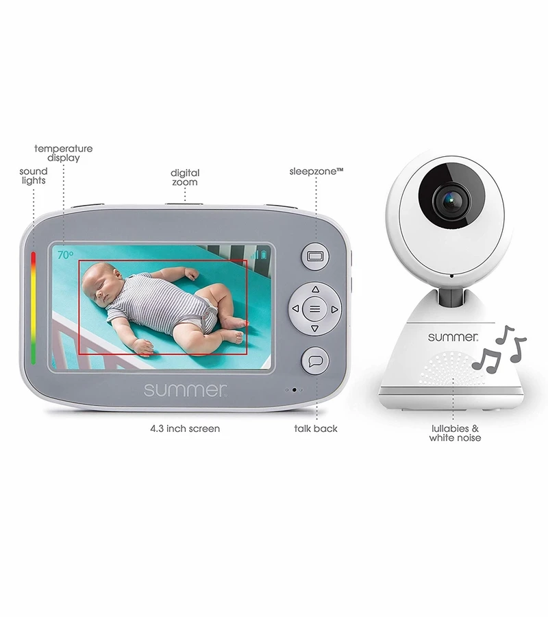 The Summer? Baby Pixel? Cadet? 4.3 Inch Color Video Monitor provides all you need in a baby monitor. The Baby Pixel Cadet features patent-pending SleepZone? technology that alerts you if baby has moved out of the virtual boundary box. You can also view baby?s entire room remotely with the remote camera steering that pans, tilts, and zooms from the parent handheld. Other convenience features include a nursery temperature display, two-way talk back to baby, lullabies, white noise, and voice activated screen wake-up (VOX).
