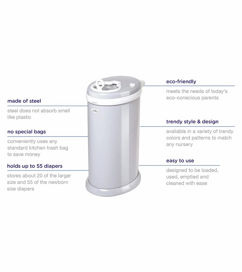 The Ubbi diaper pail is made of steel to achieve maximum odor control. It is equipped with rubber seals that are strategically designed to lock in odors as well as a sliding lid that minimizes air disruption, keeping the smell inside the pail. To meet the needs of today’s eco-conscious parents, this award-winning nursery essential offers the convenience and value of utilizing any standard trash bag or reusable cloth liner. This features makes it the easiest disposal system to load, use, empty and clean. All the style none of the smell- a promising solution for every nursery.